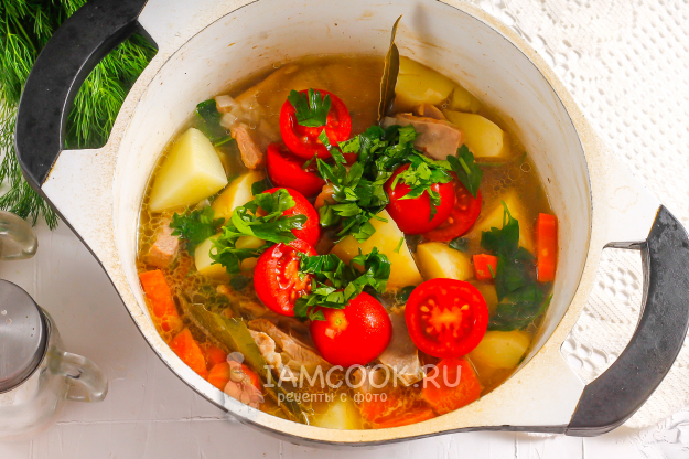 В самом конце промойте помидоры черри и добавьте их в емкость (целыми или разрезанными пополам) вместе с измельченной петрушкой. В шурпу добавляются крупно нарезанные овощи!