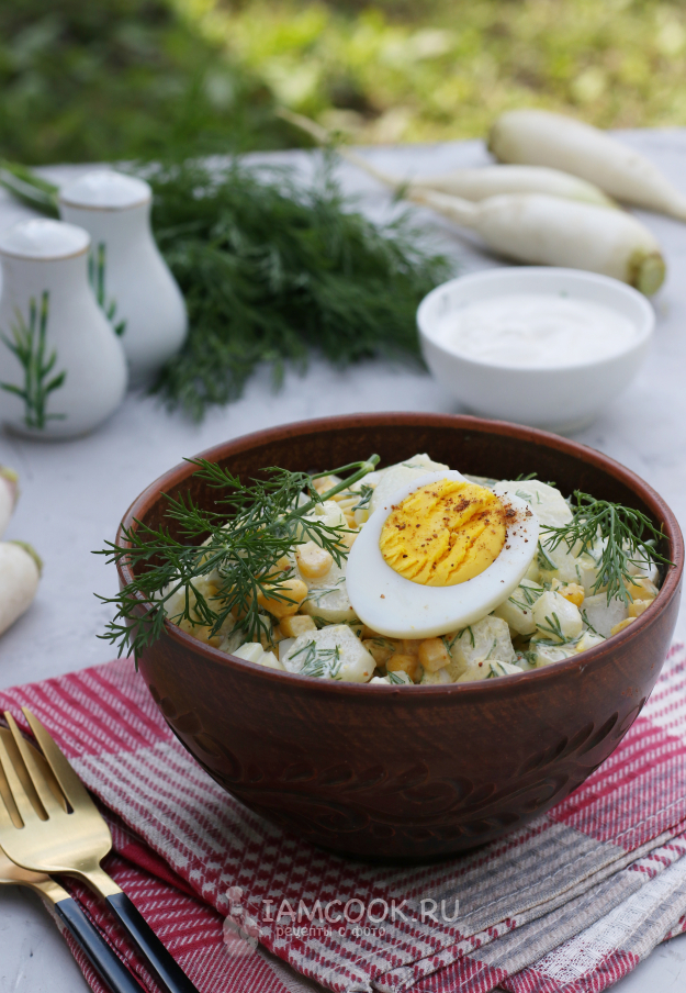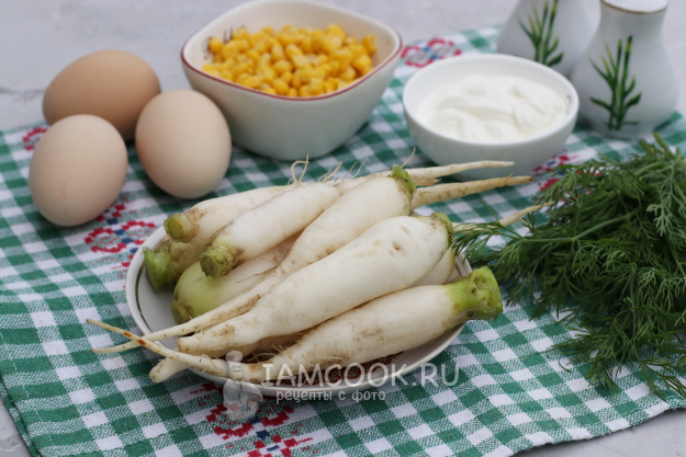 Для приготовления салата с редиской, яйцом и кукурузой подготовить из списка необходимые ингредиенты.