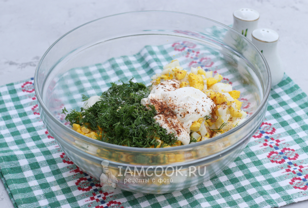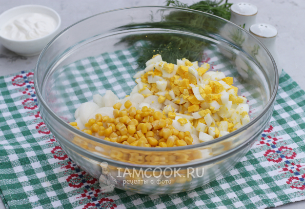 В миску сложить редиску и яйца, добавить консервированную кукурузу.