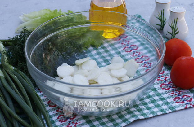Вырезать у помидоров плодоножку и нарезать их ломтиками, добавить к редиске.