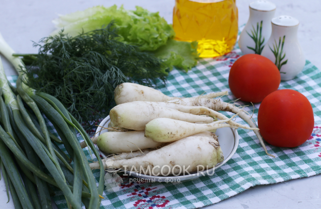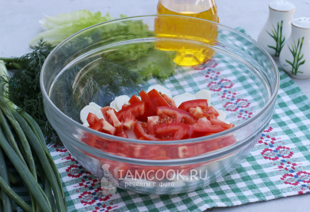 Для приготовления салата с помидорами и редиской с маслом подготовить из списка необходимые ингредиенты. Всю зелень заранее промыть и обсушить.