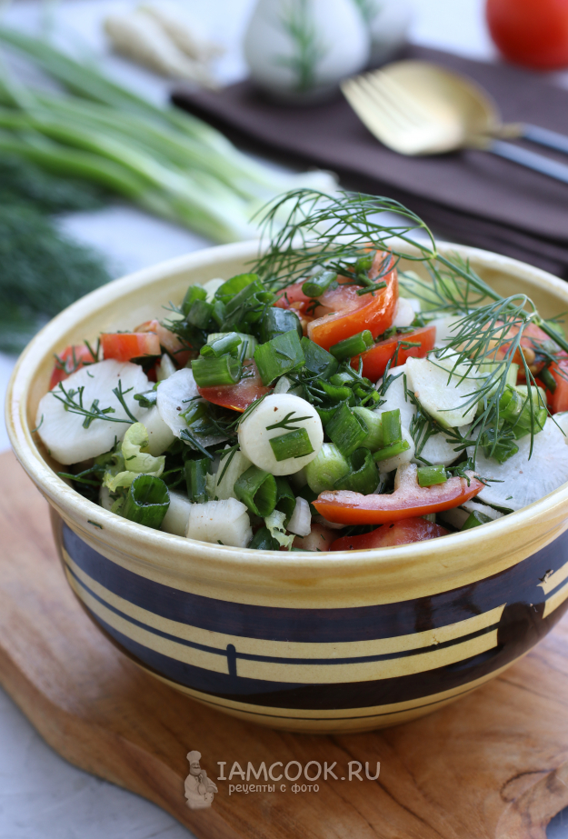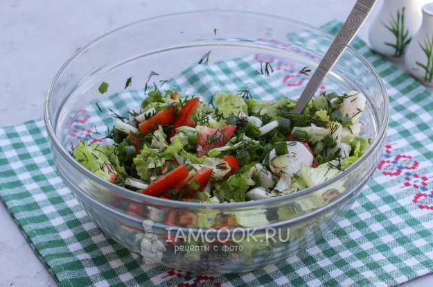 Салат с помидорами и редиской с маслом готов. Можно сразу подавать к столу.