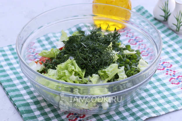 Измельчить укроп и зелёный лук, порвать руками салат латук. Добавить зелень в миску к овощам.