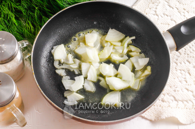 Очистите репчатый лук от кожуры, промойте его в воде и разрежьте пополам. Затем каждую половинку - еще пополам, и нарежьте все полукольцами. Прогрейте сковороду и растопите на ней сливочное масло. Выложите в него луковую нарезку и пассеруйте примерно 3-4 минуты.