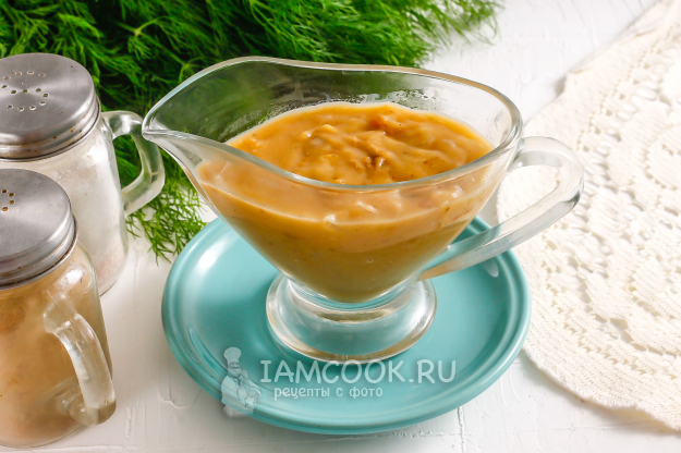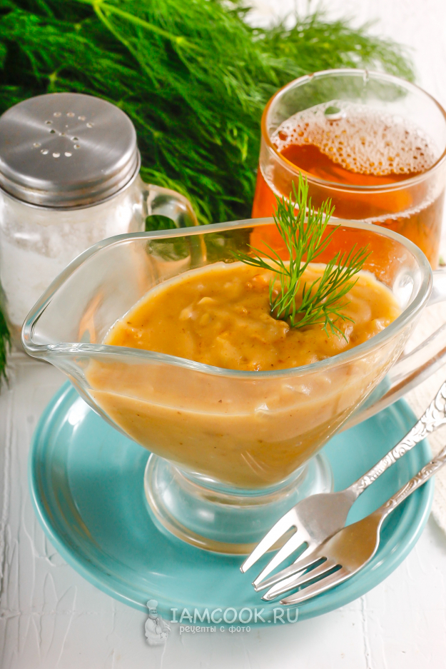 Выложите содержимое емкости в соусник и слегка остудите. Можно подавать его к столу как в горячем, так и в холодном виде. Тем, кто не любит, чтобы лук попадался, можно посоветовать пюрировать соус погружным блендером.