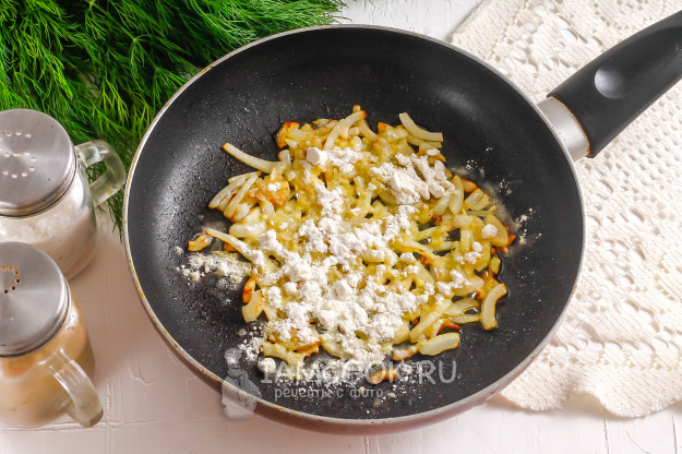 Когда нарезка подрумянится, но не подгорит, всыпьте пшеничную муку и тщательно вымешайте ее, чтобы она впитала в себя топленое масло.