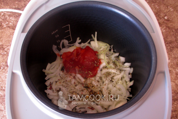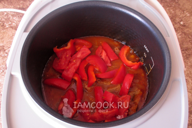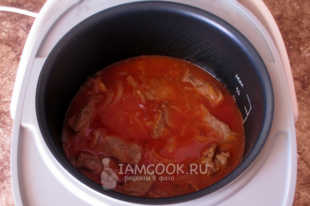 Затем влейте томатный сок, чтобы он был практически вровень с мясом. Установите режим «Тушение 2 часа».