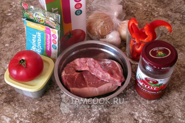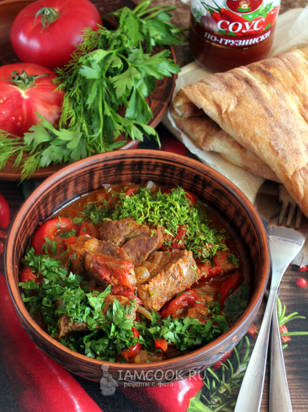 Возьмите ингредиенты для приготовления чашушули по-грузински из говядины в мультиварке.