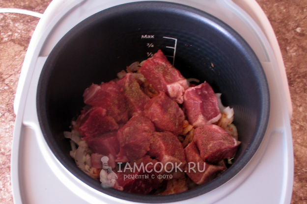 Нарежьте мякоть говядины на куски среднего размера и добавьте к луку. Посыпьте черным молотым перцем. Перемешайте ингредиенты в чаше мультиварки и оставьте мариноваться около получаса, лук даст сок.