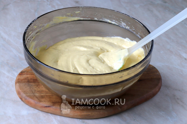 Перемешайте по направлению снизу-вверх, чтобы вся мука увлажнилась и не образовалось мучных комочков. По консистенции тесто должно напоминать густую сметану.