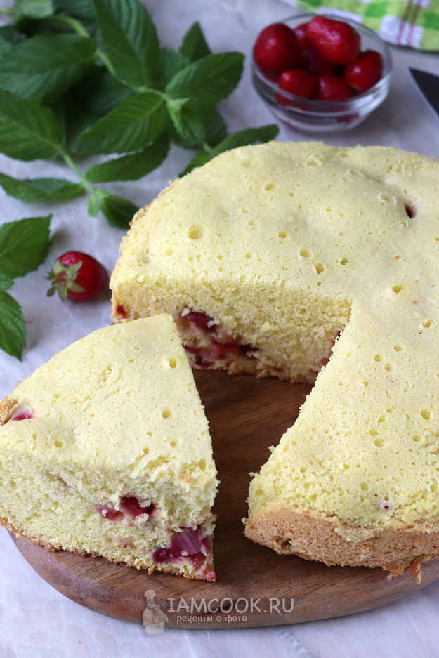 В мультиварке бисквит с клубникой получается очень вкусным и пышным. Перед подачей его следует разрезать на порционные кусочки, по желанию можно посыпать сахарной пудрой.