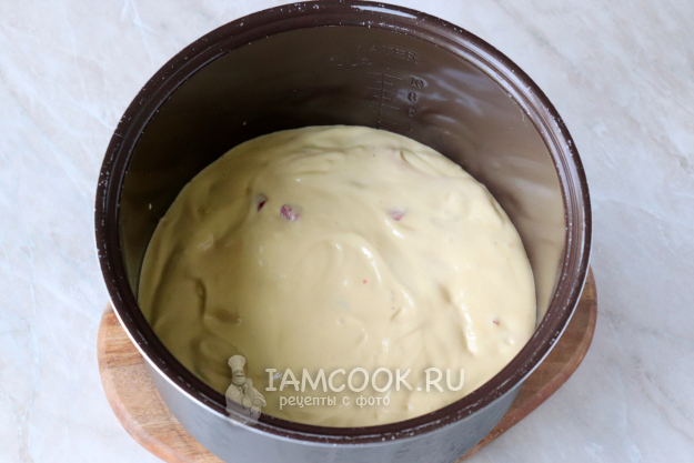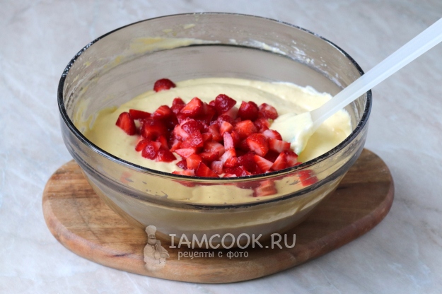 Клубнику помойте и нарежьте небольшими кубиками, добавьте их в тесто и перемешайте в последний раз.
