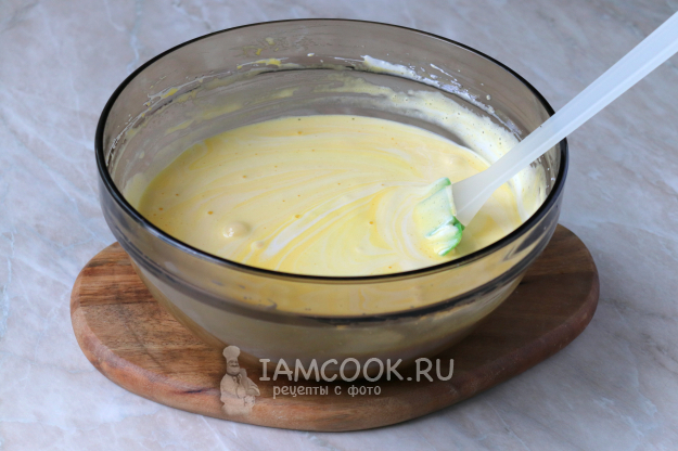 Взбитые желтки переложите в миску с белками и аккуратно перемешайте, чтобы сохранить их воздушность. Лучше всего это делать силиконовой лопаткой.