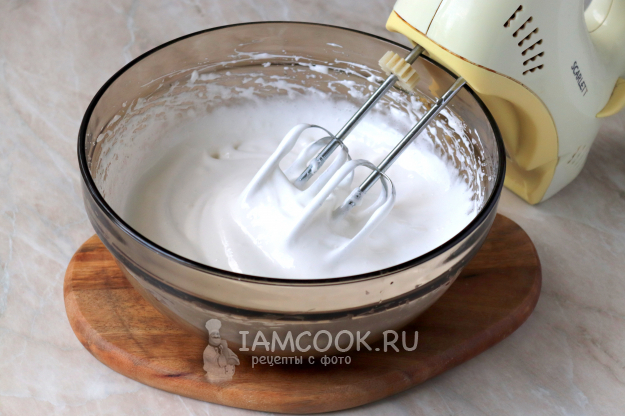 Сахар разделите пополам, одну порцию добавьте в миску с белками, а вторую всыпьте к желткам. С помощью миксера взбейте белки до стойких пиков.