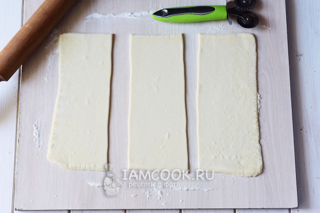 Рабочую поверхность припылим мукой. Каждый лист теста (а у меня их два) раскатаем в виде прямоугольника и нарежем на 3 полосы одинаковой ширины.