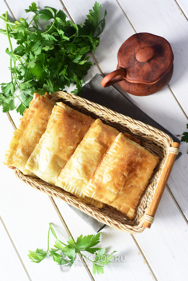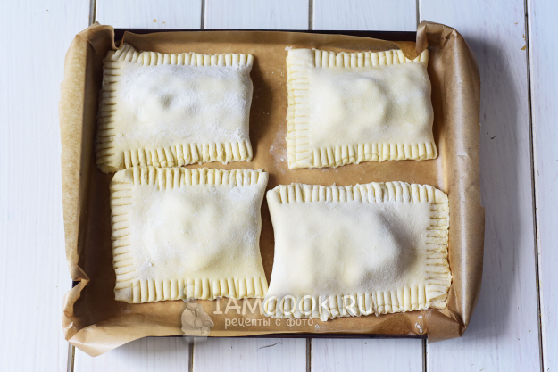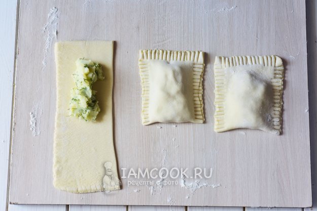 На одну половину полосы теста выложим 2-3 ч.л. картофельной начинки, накроем второй половиной теста и скрепим края вилкой, чтобы начинка оказалась надежно запечатанной внутри теста.