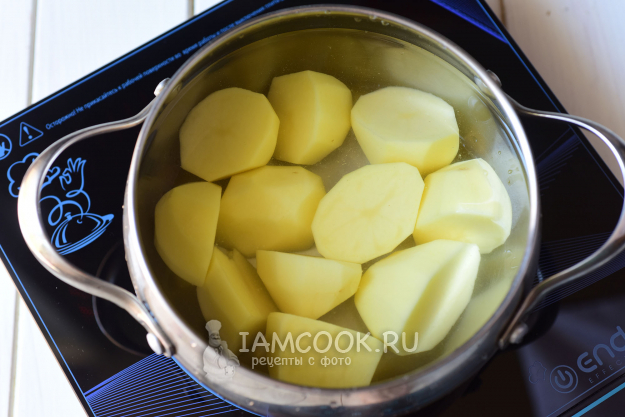 В кастрюлю выложим картофель, для удобства порежем клубни на 2-3 части. Зальем водой, чтобы она полностью покрыла овощи, поставим вариться на средний огонь до готовности. Ближе к концу варки добавим соль.