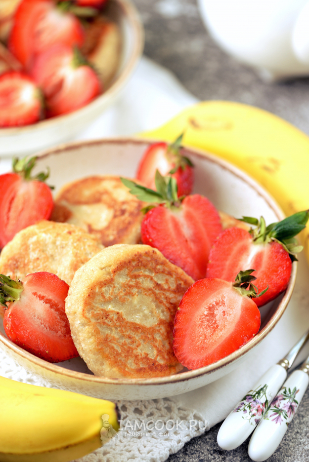 Сырники с бананом и овсяной мукой готовы. Я подавала их со свежей клубникой, которая отлично оттеняла их вкус своей кислинкой.