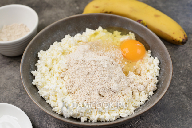 В глубокую миску переложите творог, добавьте муку, сахар и вбейте яйцо. Если творог покупной, лучше откинуть его на дуршлаг или отжать сыворотку любым удобным образом.