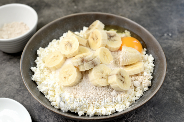 Почистите и порежьте банан, добавьте в миску. При желании можно положить немного ванильного сахара, если любите. Массу можно протереть вилкой до однородности.