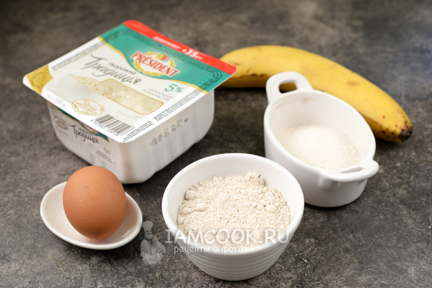 Возьмите продукты для приготовления творожных сырников с бананом и овсяной мукой. Творог можно брать любой жирности, какую больше предпочитаете.