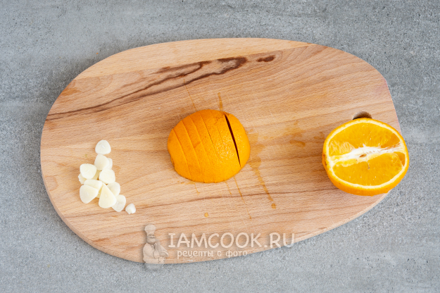 Чеснок нарезаем тонкими пластинками. А помытый апельсин делим пополам и одну из половинок нарезаем на дольки.
