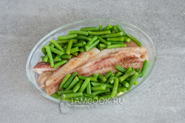 Теперь будем выкладывать всё в форму для запекания. Но предварительно её нужно смазать сливочным маслом (15 г - это половина от нашего кусочка масла). Кладём по центру формы филе минтая, а по бокам выкладываем стручковую фасоль. Кстати, фасоль я дополнительно не солила и мне так очень понравилось. Но допускаю, что кому-то соли будет не хватать, и именно на этом этапе фасоль можете дополнительно посолить. Или приготовьте как я и при необходимости досолите уже готовое блюдо.