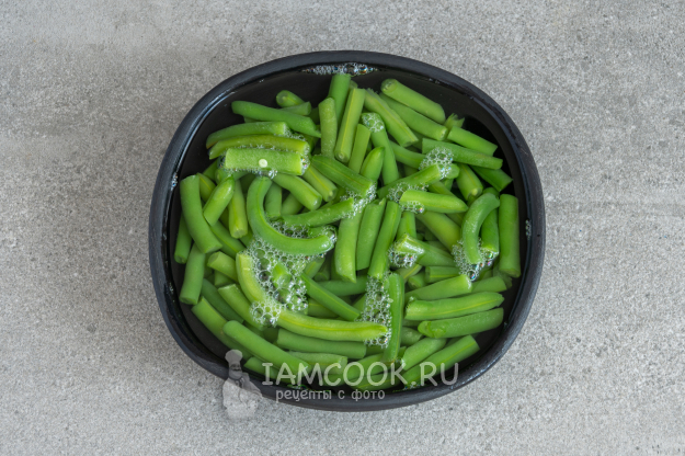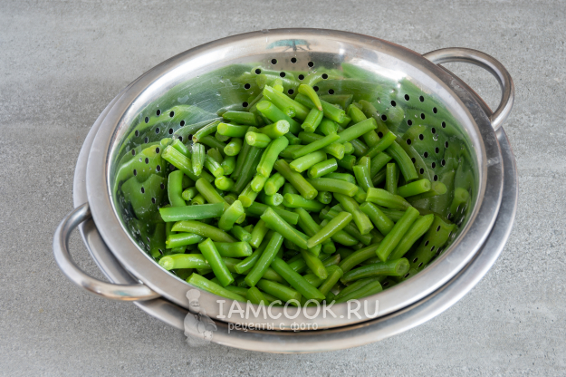 Затем замороженную стручковую фасоль заливаем кипяточком и даём так постоять минуток 5.