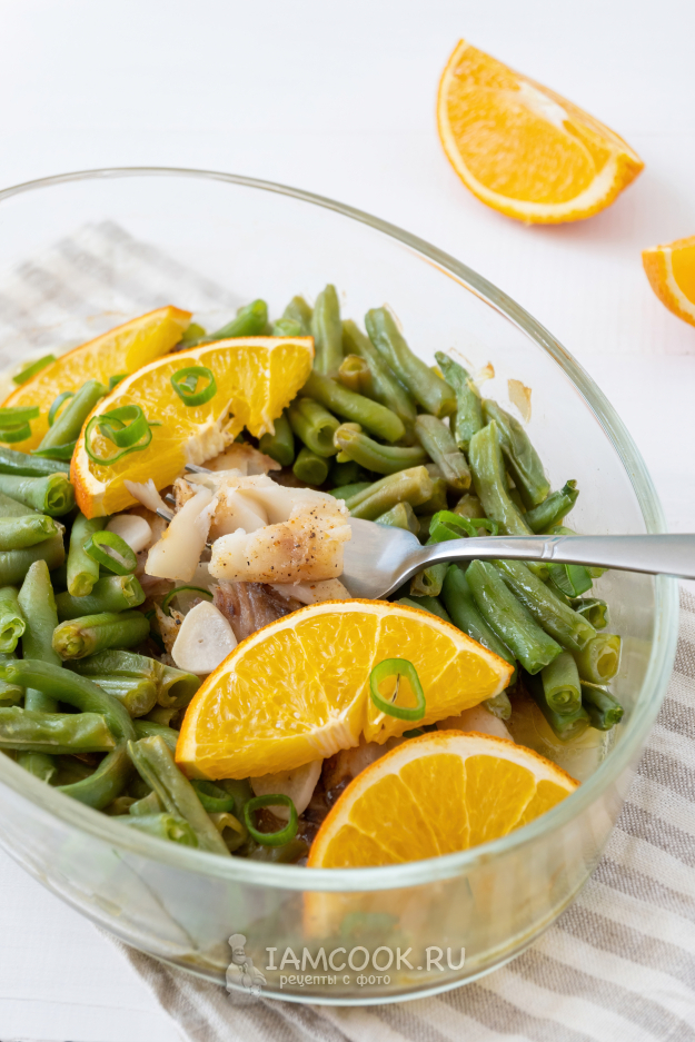 Зеленая фасоль с рыбой готова! При подаче по желанию посыпьте зеленью на ваш выбор. Кушать блюдо, как мне кажется, лучше в горячем виде и обязательно с соусом (который получился при запекании), закусывая кусочками апельсина.