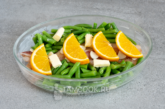 Далее рыбу и фасоль поливаем апельсиновым соком. На рыбу укладываем пластинки чеснока и дольки апельсина. А также выкладываем кусочками оставшееся масло (15 г).