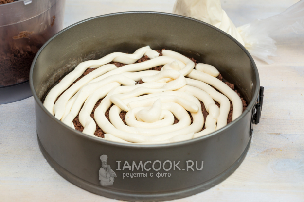 Дальше неплохо было бы творожную смесь разровнять, но сделать это не так просто - она тянет за собой крошку. Поэтому первый слой я так-сяк разровняла, остальные не стала.