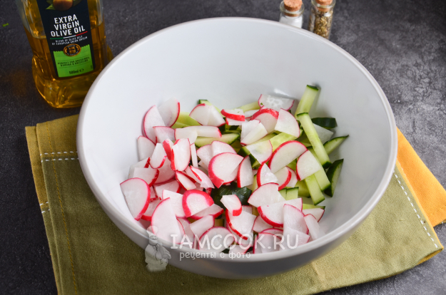 Обрежьте хвостики у редиса и нарежьте корнеплод тонкими пластинками.