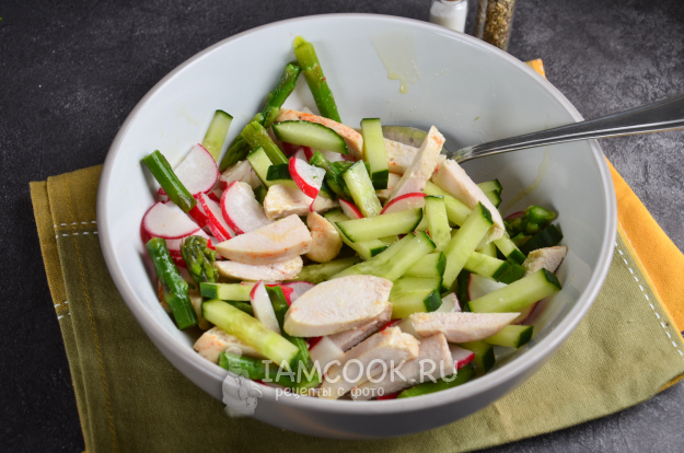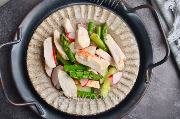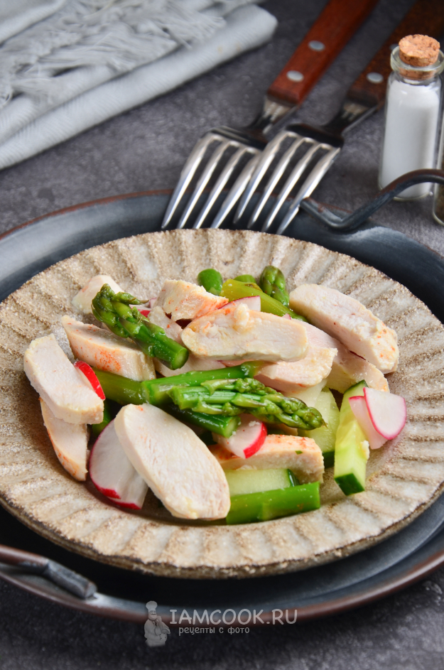Салат со спаржей и курицей готов. Положите порцию салата в тарелку и подайте. Также можно подать блюдо на стол в большом салатнике.