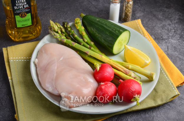 Подготовьте необходимые продукты для салата со спаржей и курицей.