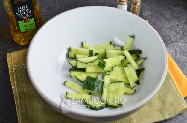 Пока запекается мясо, можно подготовить другие продукты. Огурец нарежьте тонкой соломкой и положите в салатник.