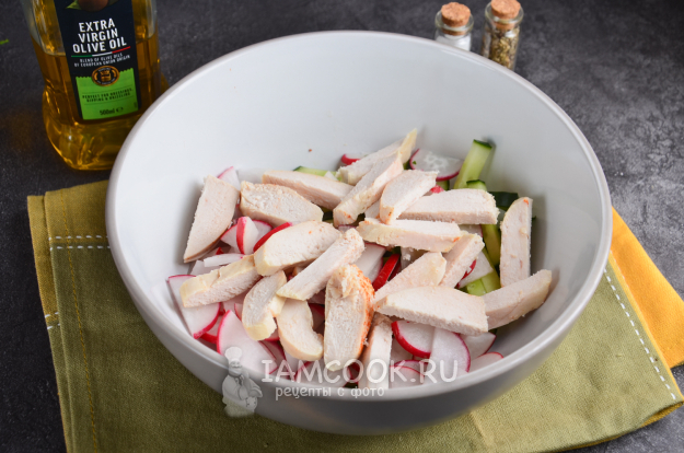 Остывшую запеченную грудку нарежьте брусочками и положите к овощам.