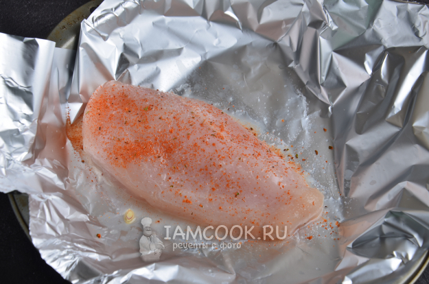 Грудку помойте и обсушите, обрежьте все лишнее. Подсолите, присыпьте специями, заверните в фольгу и запекайте при 180 градусах 20-25 минут.