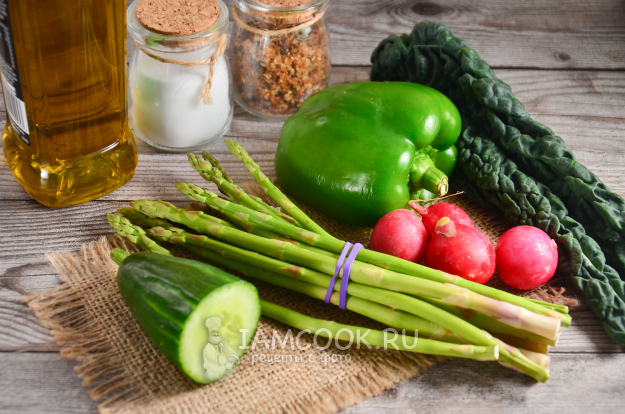 Подготовьте все нужные ингредиенты для салата со спаржей и огурцом. Для большего цветового разнообразия можно использовать желтый или оранжевый перец.
