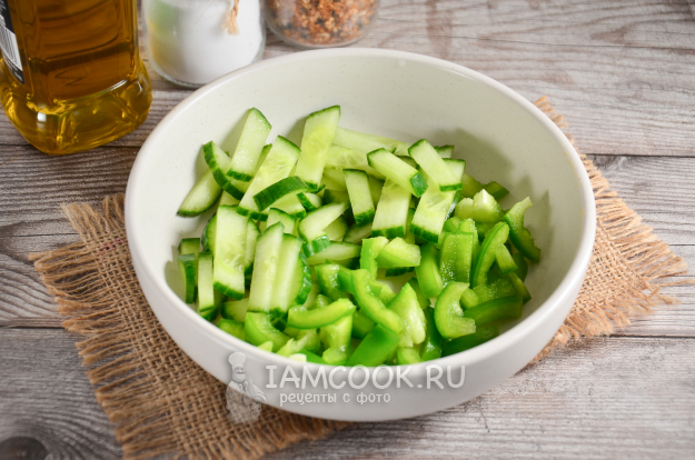 Свежий огурец нужно нарезать тонкой соломкой. Если кожура жесткая - ее лучше срезать овощечисткой. Также мелко нарежьте и добавьте в миску болгарский перец.