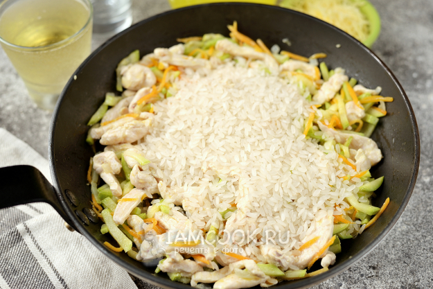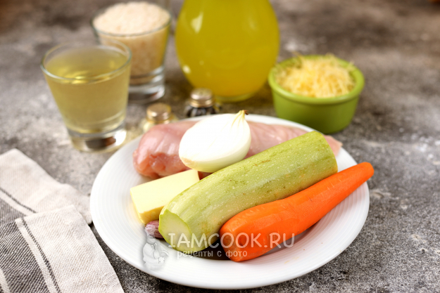 Возьмите все необходимые продукты для приготовления ризотто с курицей и кабачком. Лук, морковь почистите, срежьте с кабачка кончики с обеих сторон, помойте овощи и филе под проточной водой, обсушите все насухо. Бульон можно использовать как овощной, так и любой мясной.