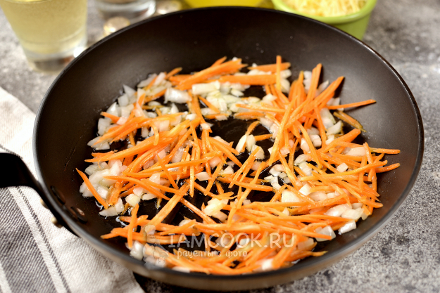 Разогрейте в сковороде растительное масло, выложите в него измельченный лук и морковь, обжарьте минуты 2 на умеренном огне.