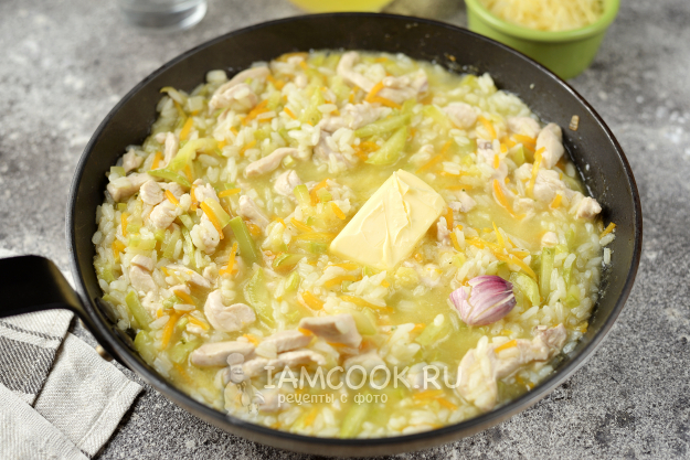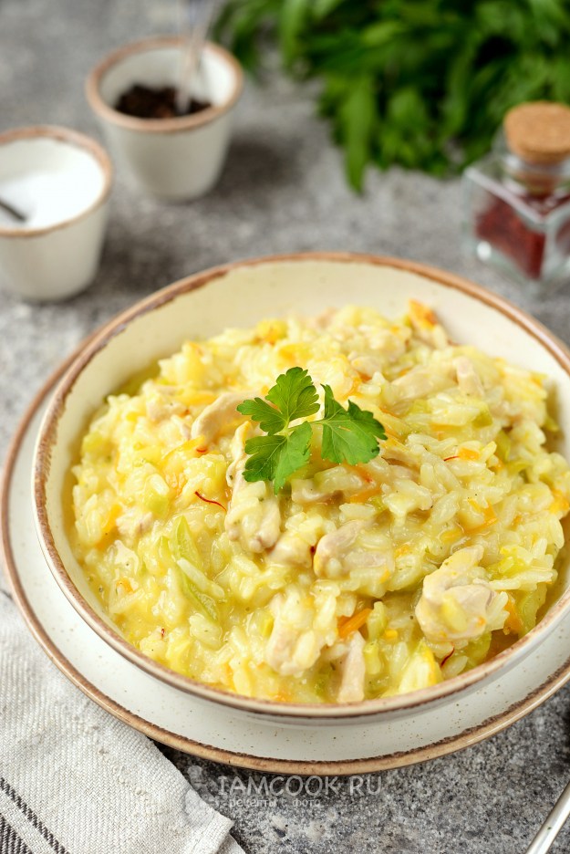 Очень вкусное и полезное ризотто с кабачком и курицей разложите по тарелкам и сразу же подавайте к столу.