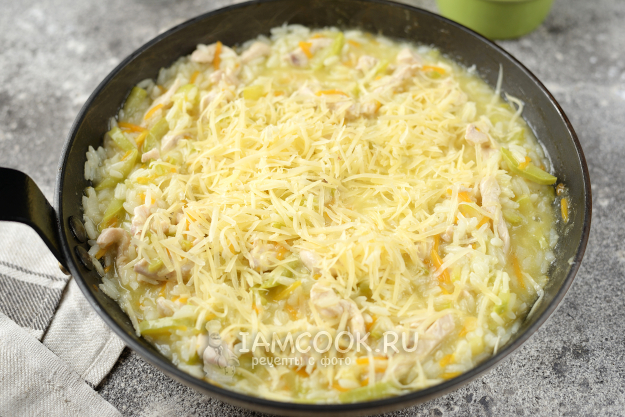 Всыпьте натертый пармезан, в последний раз перемешайте и только теперь блюдо можно досолить по необходимости. Если у вас есть шафран, положите щепоть.