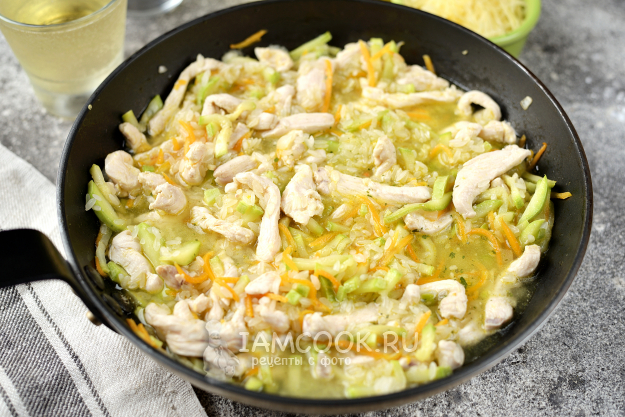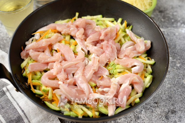 Куриное филе также нарежьте тонкими ломтиками, переложите в сковороду, перемешайте и готовьте минуты 3-4.