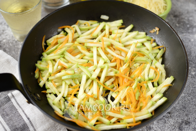 Нарежьте соломкой молодой кабачок, добавьте в сковороду, подержите еще с минуту.