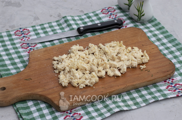Когда остынет куриное филе, его также нарезать кубиками. Если желаете посытней, то используйте всё филе. Мне хватило половины.