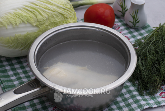 В кастрюле вскипятить воду, опустить в неё филе, добавить соль, перец горошком и лавровый лист. Варить курицу примерно 30 минут, остудить в бульоне.