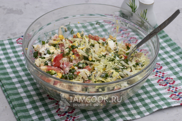 Переложить салат с пекинской капустой, курицей, яйцами и помидором в удобную посуду и подать к столу.