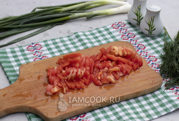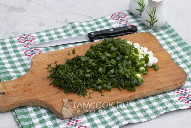 Измельчить лук и укроп. Можно также использовать петрушку.
