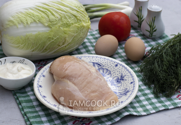 Для приготовления салата с яйцами, курицей, помидором и пекинской капустой подготовить из списка необходимые ингредиенты. Яйца и куриное филе необходимо предварительно сварить.